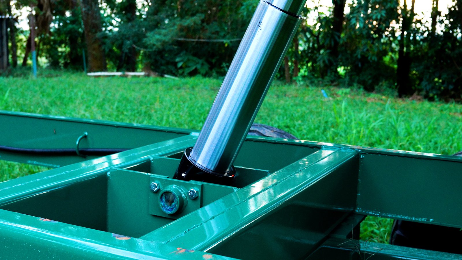 Sistema de basculamento com cilindro hidráulico telescópico de 3 estágios e ângulo de descarga de 42°, garantindo escoamento total do material, menos resíduos e maior agilidade em cada ciclo.