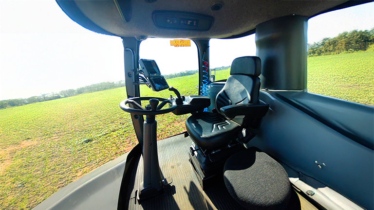 Cabine com visibilidade 360°, isolamento térmico e acústico, pressurização com filtragem por carvão ativado, ar-condicionado eficiente e ergonomia premium para longas jornadas de trabalho com mais segurança e produtividade.