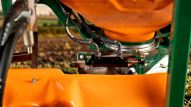 O sistema com dois discos e pás de ângulo variável amplia a faixa de trabalho e melhora a dispersão do produto, garantindo aplicação eficiente em diferentes condições de campo.